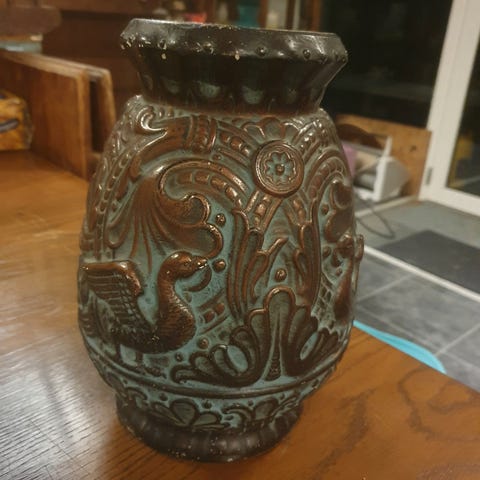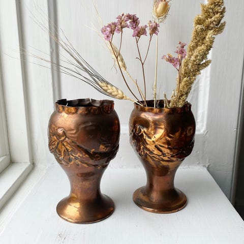 Smuk gammel Hjerteformet kobberbelagt jernvase. Tung og med relief. H: 13,5 cm. Kr 165,-