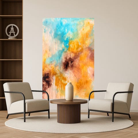 Abstrakt og super smukt maleri med blå og guldfarvede cirkler og tekstur. Maleriet måler cirka 100x120cm og kan anvendes som dekorativ vægudsmykning i hjem eller kontor.