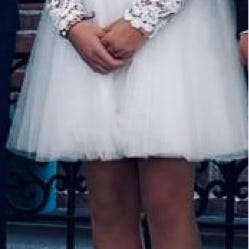 Smuk konfirmationskjole fra Brudedesign. Helt hvid med blondeoverdel og lynlås i ryggen, str 34