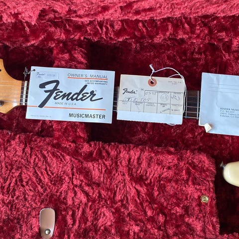1962 Fender Musicmaster in original hard case with original papers and warranty. Incredible flamed and highly figured neck not found on other examples. PRE-CBS model in Sunburst with Brazilian Rosewood slab board 21 fret fingerboard. Sunburst was only available from 1961 to mid 1963 and was different from the normal Fender Sunburst finish, likely due to being sprayed over leftover Desert Sand tan finish. 100% original aside from the normally replaced nut. Best example in the world. The pictures speak for themselves. Crazy to buy a new custom Fender when you could have this in your stable. Superb studio guitar for recording, especially in smaller booths and control rooms. If you want the very best, you are looking at it.
