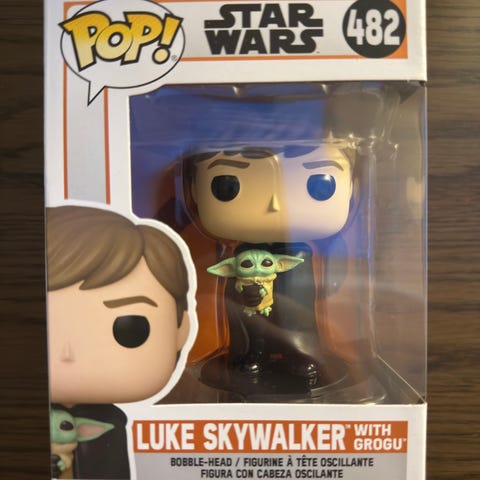 4 star wars figurer ( funko pop ) , en star wars lampe (lysende eksplosion) og en star wars arbejdslampe, formet som et rumfartøj.
