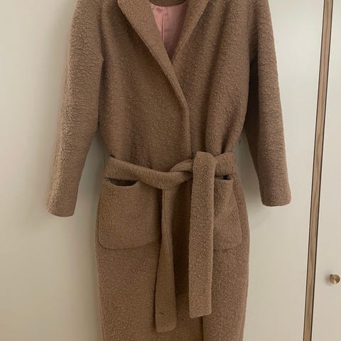 Ganni frakke i blå farve, størrelse XS, fremstillet i uldmateriale. Designet til kvinder med knaplukning og bælte i taljen. Længde til under knæet med lommer foran. Meget brugt, men stadig fin - prissat herefter. Der er en syning ved den ene lomme, som er gået og og, så er der hul i lommen, men ingen af delene kan ses. Begge ting kan nemt sys. Midnatsblå