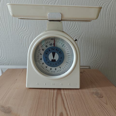 Vægt med analogt ur til måling af vægt. Uret viser vægten i kilo med en skala op til 150 kg. Vægten har en sort måleflade og rund urskive med sort baggrund og hvide tal.