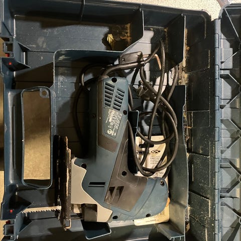 Bosch GST 90 E stiksav med forskellige klinger. Irwinklingerne er til metal, mens resten er til træ. Nogle af klingerne er ekstra lange.