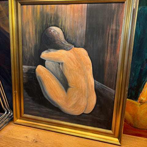 Smuk smukt billede.. er lidt i tvivl om det er oliemaling eller en form for kridt eller fedt farver .. men jeg elsker dette skønne billede af en nøgen dame der ligger ned. Billedet er sat i en flot træramme. Signeret A. Krøjgaard Mål på rammen er 55x42 ♻️ Varen findes hos Shop’n lop Fredericiavej 97 7100 Vejle. Instagram Shopn.lop.