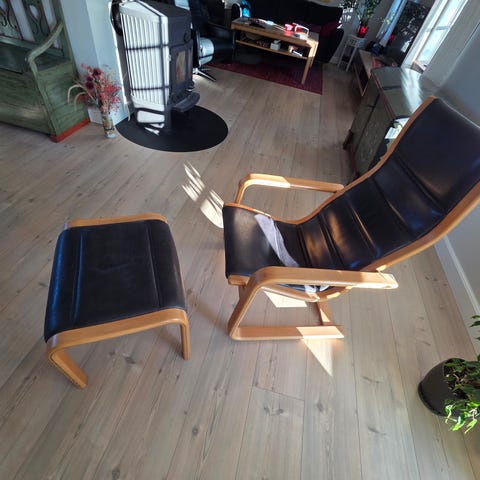 Behagelig lænestol. Mener det er lakeret bøg. Stof polster.