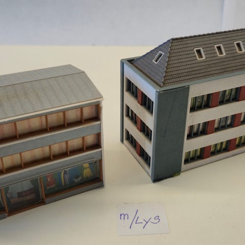 Højhus med lys - butik i stueetagen med grønt tag - pænt samlet