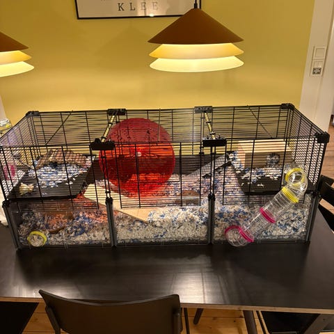 Bur til smådyr med gennemsigtig bund og metalgitter, inkluderer løbehjul, madskål, hus af pinde og andet tilbehør.