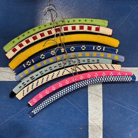 Kom godt op at hænge! Seks lækre bøjler i massiv hvid genbrugsplast. Et enkelt og stærkt design med 80’er look. Så flotte at de kan hænge frit i din entré. 44,5 cm brede. I perfekt stand. Sælges samlet for 145 kr.