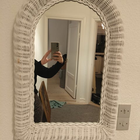 Hvidt træspejl med tilhørende hylde. Spejlet er rektangulært og monteret på en ramme med en lille hylde under. Velegnet til opbevaring af småting eller dekoration.