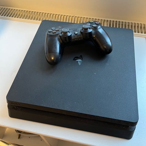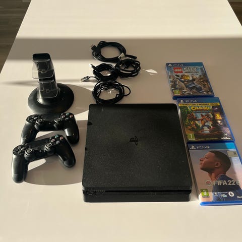 Playstation 4 spillekonsol inklusive en controller, strømkabel samt to spil: FIFA 21 og Gran Turismo Sport. Konsollen er sort og designet til hjemmeunderholdning.