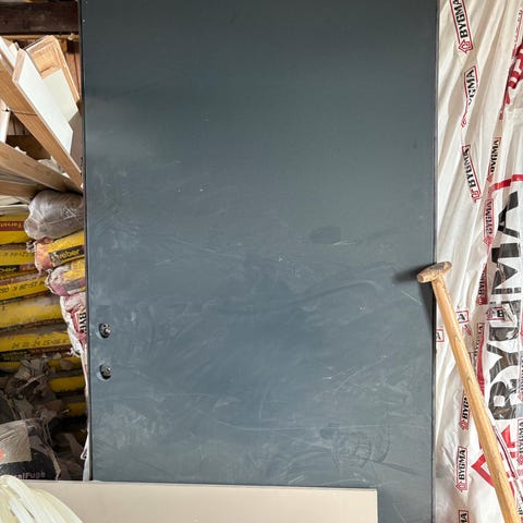Hvid dør med karm og lås. Døren er fremstillet i træmateriale og har en enkel, ensfarvet hvid overflade. Den er velegnet til indvendig brug i boliger eller erhvervslokaler. Karmen følger med døren, og Ruko greb er monteret Døren har mindre brugsspor og ridser.
