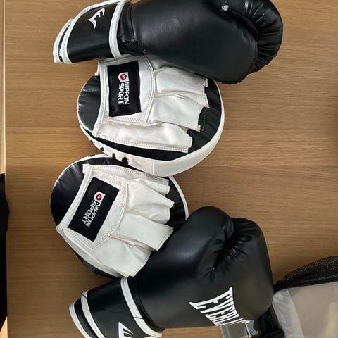 Everlast boksehandsker i størrelse XL i sort farve. Boksebold i sort materiale med Everlast logo. Sættet inkluderer boksehandsker og boksebold, velegnet til træning og bokseøvelser.