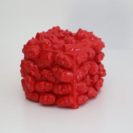 Blue Cube er en ophobning af flere gipshoveder placeret på en træklods. Kunstneren arbejder udelukkende ud fra sit eget selvportræt, som han varierer i alle sine værker, i forskellige størrelser, farver og materialer. Denne bevidste gentagelse styrker udforskningen af identitet, hukommelse og tilstedeværelse.