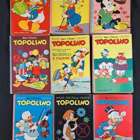Lotto bestående af 91 Topolino hæfter i næsten komplette serier fra 605 til 699, undtagen numrene 620-636-639, Mondadori, juli 1967 - april 1969. Blandede tilstande, fra god til fremragende. Nr. 605 i fremragende samlet stand, minimal slitage under hologramfiguren. Nr. 618 i god stand. Nr. 626 og 627 i rimelig stand. Nr. 621-628-629 uden mærke. Nr. 658-659-664 uden mærke. Nr. 665 komplet med det reklameindlæg Vagnino Valigetta. Nr. 666-672-673 uden mærke.