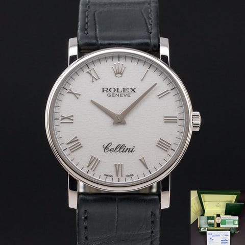 Rolex Cellini Date 50519, herreautomatisk ur i hvidguld 18K, kasse 39 mm, sort guilloché skive, læderrem lang størrelse, med original æske og papirer. Klik på den blå "gå til varen" knap, for at købe eller byde på denne vare. Den samlede pris vil blive vist inden du afgiver dit bud.