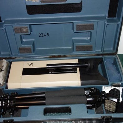 Meget usædvanlig magnesium blitzlampe af Nichols, St Louis, USA. En blitz enhed, der var tiltænkt større grupper, områder eller flash-billeder af bygninger. Blitzet er lavet af zink, som ser ud til at være kraftigt korroderet. Et unikt stykke af fotografisk historie og svært at finde. Størrelse 25 cm bred, 15 cm høj.