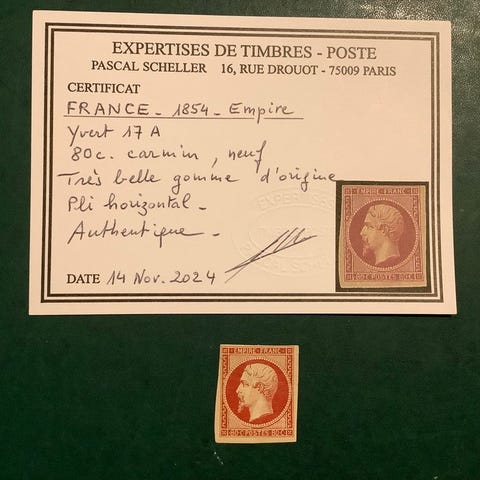 Frankrigs oprindelse, 1 Fr Napoleon Empire genoptryk med luksus marger, Yvert 18d, ubrugt, fra 1853, katalogværdi €2.500 (Yvert 2022). Klik på den blå "gå til varen" knap, for at købe eller byde på denne vare. Den samlede pris vil blive vist inden du afgiver dit bud.