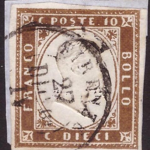 Sardinien 1861, sjældent værdi af 10c mørk chokoladebrun (14Ce), cert. Cardillo, 2 signaturer på bagsiden, godt margineret.