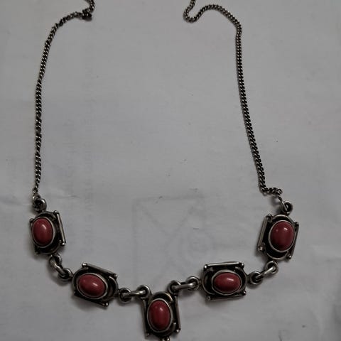 Dametilbehør i sølv med naturligt lyserødt koraller, flere tråde i torchon-design, vægt 300 g, i fremragende stand med små tegn på brug. Klik på den blå "gå til varen" knap, for at købe eller byde på denne vare. Den samlede pris vil blive vist inden du afgiver dit bud.