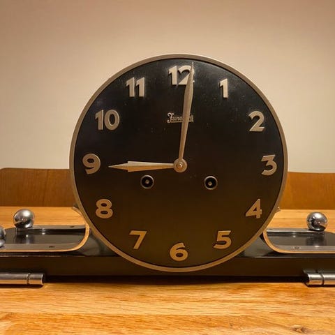 Uret bærer mærket fra Gioielleria Carbone, Bra. Smukt antikt bordur fra mærket WALT (meget sandsynligt Vesttyskland, 60'erne/70'erne). Type: Bordur (ikke vægur). Mærke: WALT (læseligt på urskiven). Stil & materiale: Forgyldt messing/bronze kasse med rige dekorationer i Revival Barock/Rococo stil. Bevægelse: Mekanisk med manuel optræk.