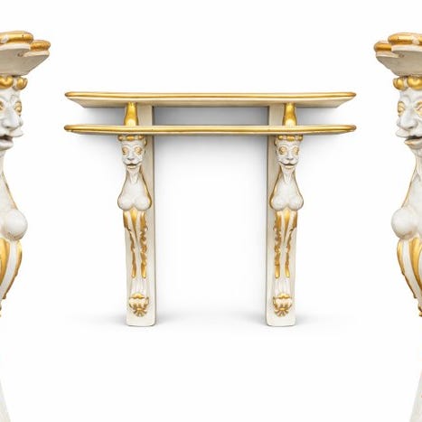 Artigiani Canturini præsenterer en håndlavet konsol i Imperie-stil fra midten af det 20. århundrede i palissandro brasiliano med bord i marmore vermelho Verona, tre skuffer for, bronzebelægning og sabelt-formede ben, målene 200 cm bred, 43 cm dyb og 88 cm høj; Proveniens Italien, Lombardia (Cantù); god stand med små aldersrelaterede tegn. Klik på den blå "gå til varen" knap, for at købe eller byde på denne vare. Den samlede pris vil blive vist inden du afgiver dit bud.