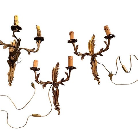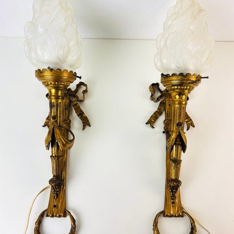 Par af Empire-bronze vægarmaturer fra Lucien Gau, model 15003, håndlavet i Paris, Frankrig, bronze med kejserligt grønne og antikguld finish, hver 44 cm høj, 37 cm bred, 25 cm dybde, tre E14-fatninger båret af svaner, i næsten nysmuld tilstand og i funktionsdygtig stand. Klik på den blå "gå til varen" knap, for at købe eller byde på denne vare. Den samlede pris vil blive vist inden du afgiver dit bud.