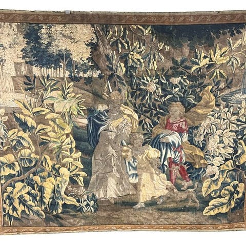 Der tilbydes et stort, håndvævet Gobelin-vægteppe.