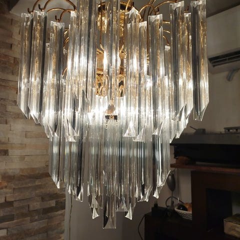 Lampen har en spektakulær, otte-lags, pyramideformet baldakin bestående af snesevis af uregelmæssigt snoede krystalstænger, karakteristisk for en håndlavet proces. Hver stang ender i en blomsterformet finial, et sjældent og dekorativt element.