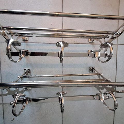 Fransk Art Deco-gulvur i metal, aluminium og krombelagt stål, med fem glidehager på hver side og en hatstativ med tre stænger, mål 68 cm bred, 22 cm høj, 26 cm dyb, estimeret periode 2000–2010, oprindelse Europa, i god stand med mindre tegn på slid og pletter. Klik på den blå "gå til varen" knap, for at købe eller byde på denne vare. Den samlede pris vil blive vist inden du afgiver dit bud.