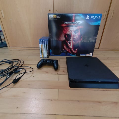 Sony Playstation 4 Slim 1TB - Konsol i meget god stand og tilbage til fabriksindstillinger. Den sælges med en original trådløs sort joystick og en ikke-original blå kablet joystick.