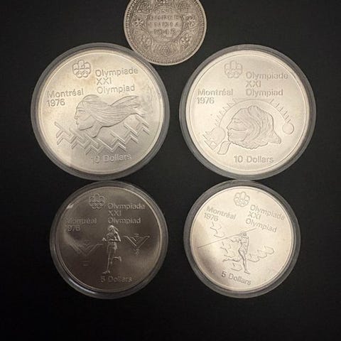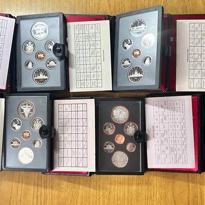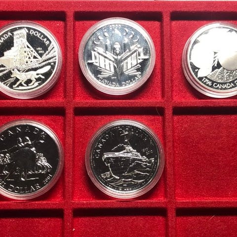 Canada Lotto af 6 serier af proof-mønter, år: 1986, 1987, 1988, 1989, 1990, 1994, med 5 sølvmønter på 1 dollar i 500 finhed og 1 i 925 finhed sølv, i henhold til billedet, med små fejl på emballagen.