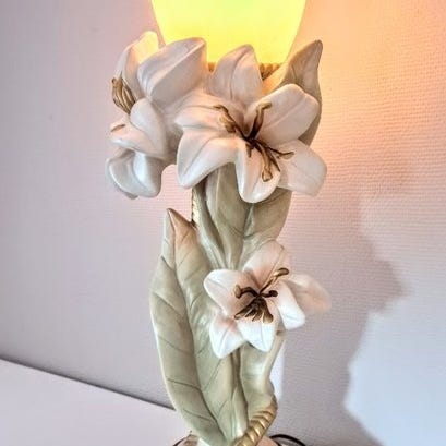 Betagende smuk, meget dekorativ og yderst elegant stor porcelæns lilje-blomst bordlampe. Stykket er smukt designet og lavet med stor kvalitet og detalje. Lampen er virkelig fantastisk med imponerende detaljer og charme. Vi mener, at stykket er i overordnet god original stand med nogle mindre tegn på ælde. Se venligst billederne for din reference.