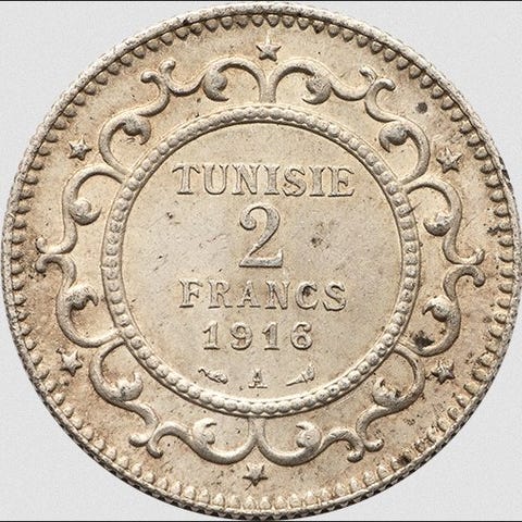 Tunesien, 10 Francs, 1939, sølvmønt i ubrugt tilstand uden certificering. Klik på den blå "gå til varen" knap, for at købe eller byde på denne vare. Den samlede pris vil blive vist inden du afgiver dit bud.