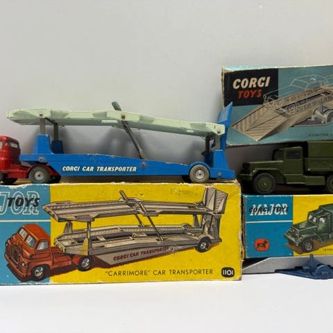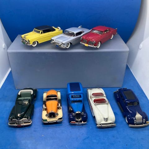Et sæt på 15 Dodge diecast minibiler i kategorierne utilitærer og pickups fra 1940–1950, mange med vitrinekasser, i cirka 1:43-skala og af zamak, i meget pænt stand. Klik på den blå "gå til varen" knap, for at købe eller byde på denne vare. Den samlede pris vil blive vist inden du afgiver dit bud.