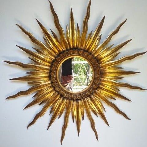 Trækonveks solspejl, fremstillet i Frankrig, i næsten ny tilstand, Ø45 cm, ydre mål 45 × 45 cm, dybde 7,5 cm, indre mål 45 × 7,5 cm, vægt 1,34 kg, gylden farve, sandsynlig periode 1950–1960, sjældent mønster med etager. Klik på den blå "gå til varen" knap, for at købe eller byde på denne vare. Den samlede pris vil blive vist inden du afgiver dit bud.