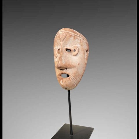 Fængslende maske fra Fon i Bénin. Den forestiller en abe med et kraftfuldt og aggressivt ansigt. Dens blik er skarpt og understreget. Den viser sine tænder i en udfordrende position. Det er et levende kunstværk, der udstråler en særlig kraft fra denne maske. Den er dækket af flere lag af gamle malinger. Smuk patina. Der er nogle skader, solgt som den er, se billeder. Billederne er en del af beskrivelsen. Et smukt stykke af ældre og autentisk samlerobjekt, circa 1960.