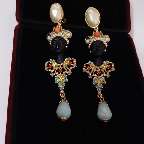 Lewis Segal vintageinspirerede hestehovedøreringe, 18 karat guldbelægning med håndmalet emalje, sølvstifter, samlet vægt 44 g (22 g per ørehænger), højde 7,20 cm, bredde 2,80 cm, bly- og nikkelfri, fremstillet i Frankrig, ny. Klik på den blå "gå til varen" knap, for at købe eller byde på denne vare. Den samlede pris vil blive vist inden du afgiver dit bud.