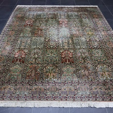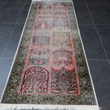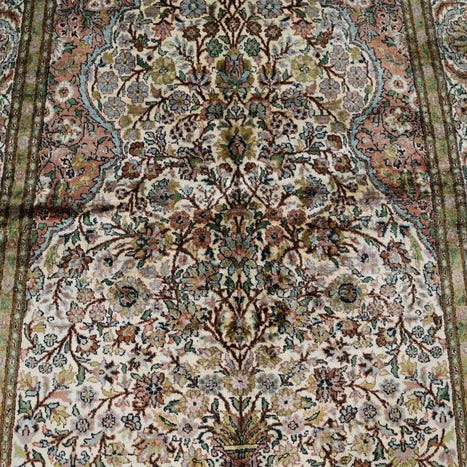 Én enkelt håndvævet tæppe i silke på bomuld, model Kaschmir Seide, oprindelse Indien, fra slutningen af det 20. århundrede, mål 178 cm x 128 cm, i god stand med alders- og brugsspor. Klik på den blå "gå til varen" knap, for at købe eller byde på denne vare. Den samlede pris vil blive vist inden du afgiver dit bud.