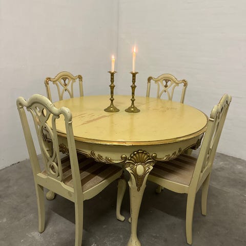 Gammelt massivt rundt Spisebord malet og i forgyldt træ. Design a Georg Kofoed Et herligt stort rundt spisebord dia 130 indskudplader 3 x 60 indskudsplader 75 h, hvor der kan sidde rigtigt mange ved 1600kr... 8 George Kofoed Spisebordstol ingen løse stole, betræk lidt smudsig 8 stk Spisebordstol 400kr.. Spisebord med stolepris 1800kr.. Gammel massiv slagbænk med stort opbevaringsrum 1400kr. Kan levere mod betaling