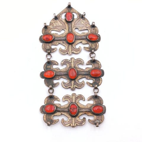 Ottomansk armbånd i antik byzantinsk stil i højkvl kvalitets sølv, vægt 56 g, med tre smaragder som hovedsten (i alt 4 ct) og to omgivende smaragder (i alt 3 ct), hovedstenen firkantet og de omgivende sten rektangulære, omkreds 18 cm (armbåndstørrelse Stor 18–18,5 cm), i god stand med brugsspor og uden laboratorierapport. Klik på den blå "gå til varen" knap, for at købe eller byde på denne vare. Den samlede pris vil blive vist inden du afgiver dit bud.