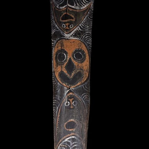 Tre bambusholdere fra Papua Ny Guinea, dateret til midten af det 20. århundrede og stammer fra en privat samling, herunder to Geelvink Bay-stykker (28 cm og 22 cm) og en lille Timor-beholder (11 cm), med Cenderawasi-motiver og i god stand, den største cirka 28 cm høj. Klik på den blå "gå til varen" knap, for at købe eller byde på denne vare. Den samlede pris vil blive vist inden du afgiver dit bud.