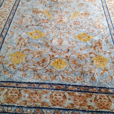 Materialet: Ren luksus Disse tæpper er lavet af ren naturseide. Anvendelsen af seide både til løbetæppet og ofte til kernen (grundstrukturen) muliggør en ekstremt høj knudetæthed. Resultatet er en utroligt fin, næsten billedlig gengivelse af mønstrene og en overflade,
