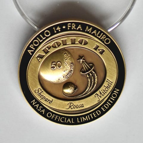 Toppe viser de officielle logoer for de forskellige missioner i NASA's Apollo-program.