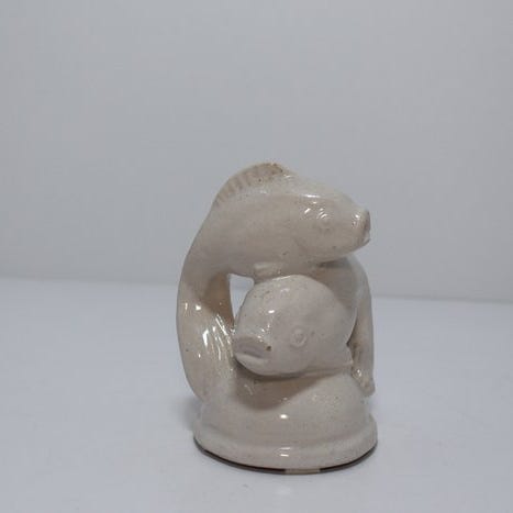Sluiergoudvis, en u-signeret Art Deco-keramikskulptur fra Nederlandene, mål 10 cm bred, 20 cm høj, 18 cm dyb, vægt 0,65 kg, grå, i god stand. Klik på den blå "gå til varen" knap, for at købe eller byde på denne vare. Den samlede pris vil blive vist inden du afgiver dit bud.