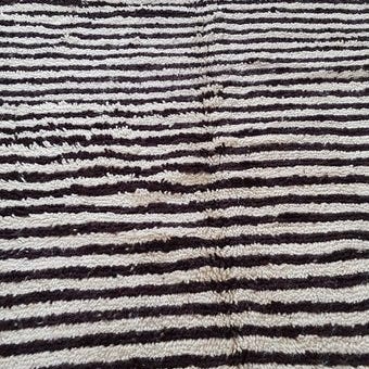 Dette karakteristiske marokkanske Berber-tæppe er et nyvævet stykke skabt af dygtige håndværkere ved brug af traditionelle teknikker. Det kombinerer autentisk Berber-håndværk med et dristigt, moderne kunstnerisk udtryk.