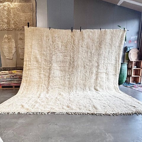Forvandl dit hjem med dette berberteppet Mrirt hvidt, håndvævet af erfarne marokkanske håndværkere. Med en generøs størrelse på 200 x 300 cm kombinerer dette tæppe i naturlig uld ægthed og elegance.
