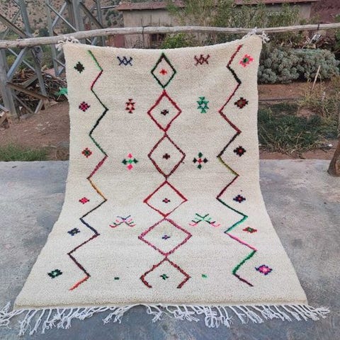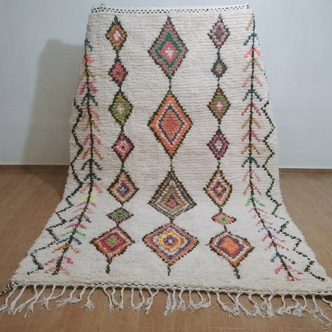 Motiver i diamantformer og ujævne linjer giver stykket en unik kunstnerisk karakter, typisk for berberkunst, hvilket gør dette tæppe til et ægte håndværksværk. Frynserne er originale og vidner om dets ægthed.