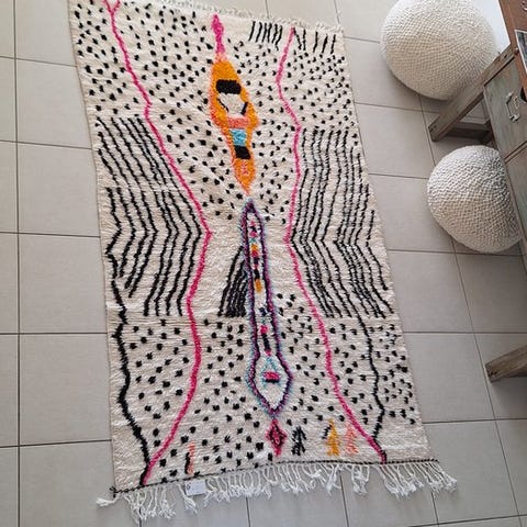 Magnifik marokkansk berbisk løber, helt håndvævet efter de traditionelle teknikker. Denne løber skiller sig ud med sin naturlige, råhvide baggrund i tykt og blødt uld, dekoreret med abstrakte og symbolske geometriske mønstre i livlige farver: lyserød, orange, rød, blå, sort og gul.