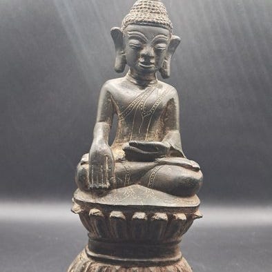 Antik bronze Mukhalinga Shiva-hoved fra Maharashtra, Indien, i Maratha-rigets stil (1674–1818), 13 cm høj, bronze, original attribution fra privat samling, i fremragende stand. Klik på den blå "gå til varen" knap, for at købe eller byde på denne vare. Den samlede pris vil blive vist inden du afgiver dit bud.
